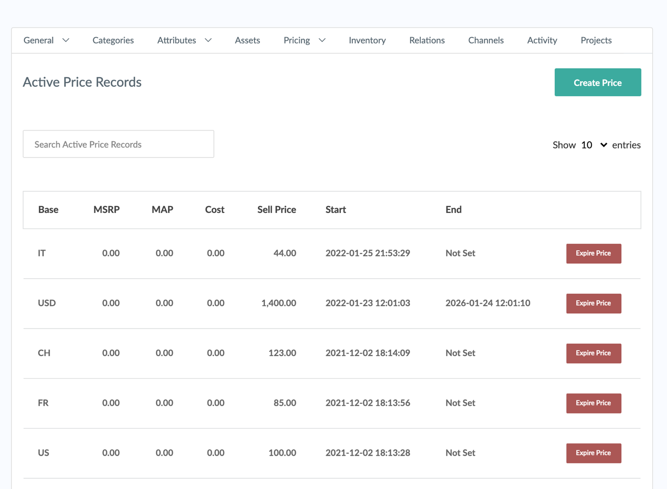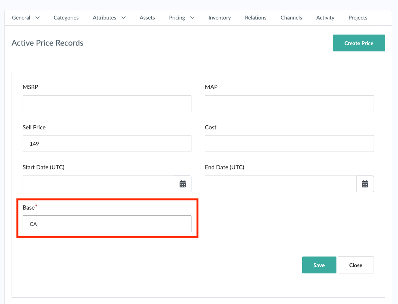 Now you can start to use the price lists in the PIM and create prices for the products. Use the country ISO code in the price Base to map the price with the corresponding price list. In the example below we will create a new record in the Canada price list for this specific product.