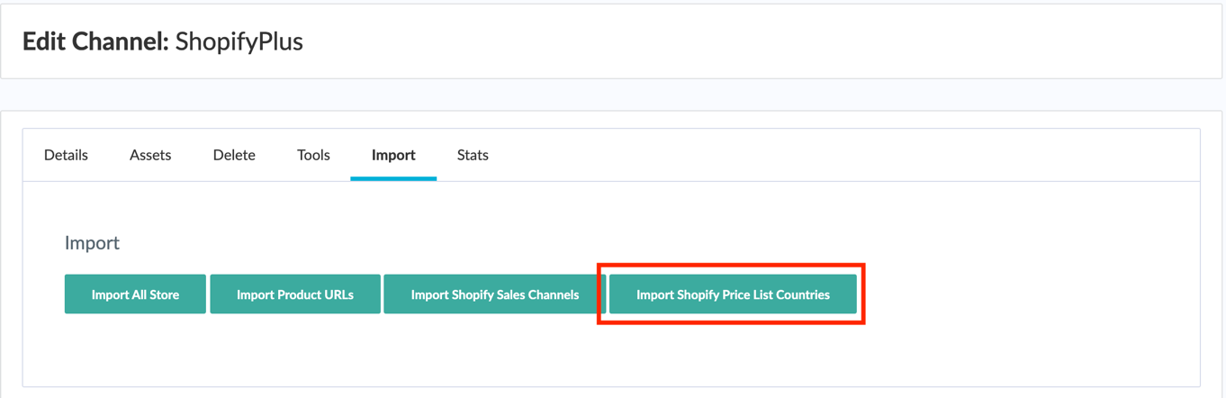 Once you have the price lists in Shopify, you need to import them into the PIM. Go to Configuration > Channels and select your Shopify channel. Go to the Import tab and click on the Import Price List Countries button to start the import. The process will run in background. (You can check the progress in the Jobs section)