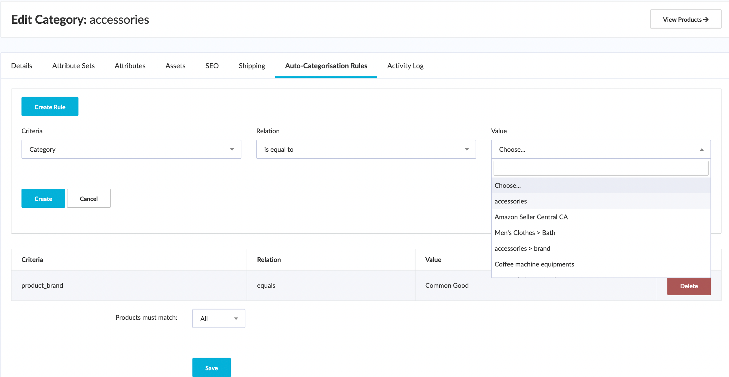 This section will only be available with "Smart Category? - Yes" and here you can create rules that, depending on previous "product must match" configuration (all/any conditions), it will include automatically all the products fitting in the criteria.