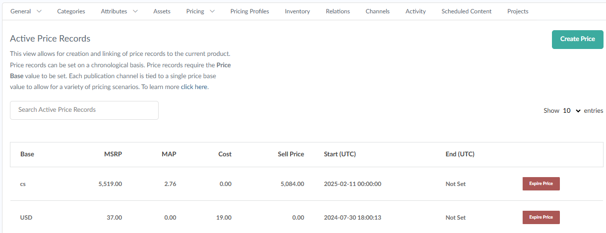 If you are selling products across multiple websites or marketplaces or potentially in different currencies you may need to sell the same product at different prices. By using separate price bases tied to separate channels you can effectively manage all your published prices from a single point inside the PIM.