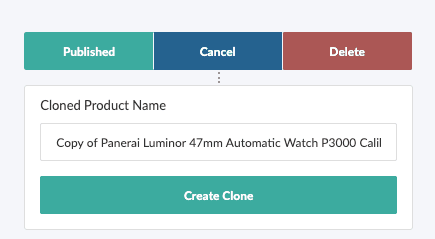Note: Cloned products are intended to function as separate products within the PIM and on your publication channels. If you are looking to create a parent child relationship where groups of similar items display on a single product page with pivotable choices tied to SKUs read this article on Understanding Options and Parent Child Products.