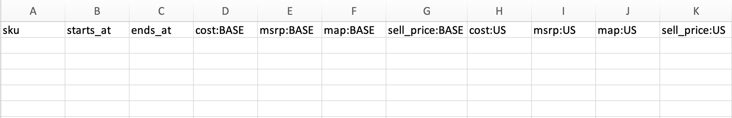 | “starts_at” | Gets mapped to the Start Date (UTC) on the product pricing. Although this field is not mandatory, it is important to note that if it is left blank the price will expire automatically but it won’t be synced with your storefront. |