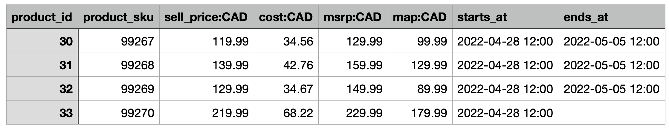 In the example below the importer will try to find if there is any product with the SKU “99267”. If found, the product price will be updated with the Sell Price:119.99, Cost:34.56, MSRP: 129.99, Price Base: CAD, Start Date: 2022-04-28 12:00, and End Date: 2022-05-05 12:00. The importer will try to locate a product price with the given SKU, if none is found it will create a new product and assign that SKU into it. If the SKU is blank, it will try to locate the product by ID.