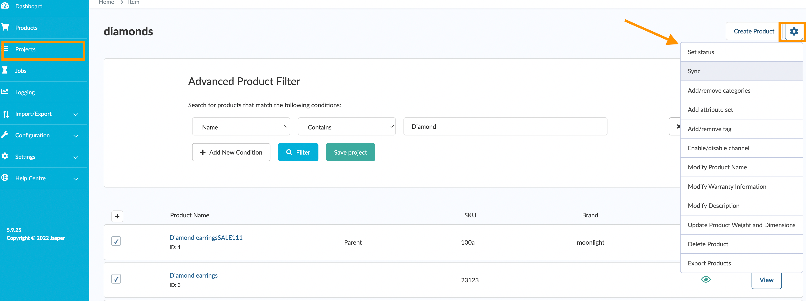 - Click the Gear icon on the upper right of the page next to the Create Product button to display the list of available batch actions.
