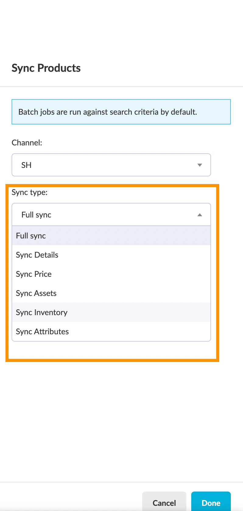 You can select the type of sync that you would like to trigger to update the selected products inside a project to the selected channel. The following sync types are available on the Sync Type drop-down list for the Sync batch action:
